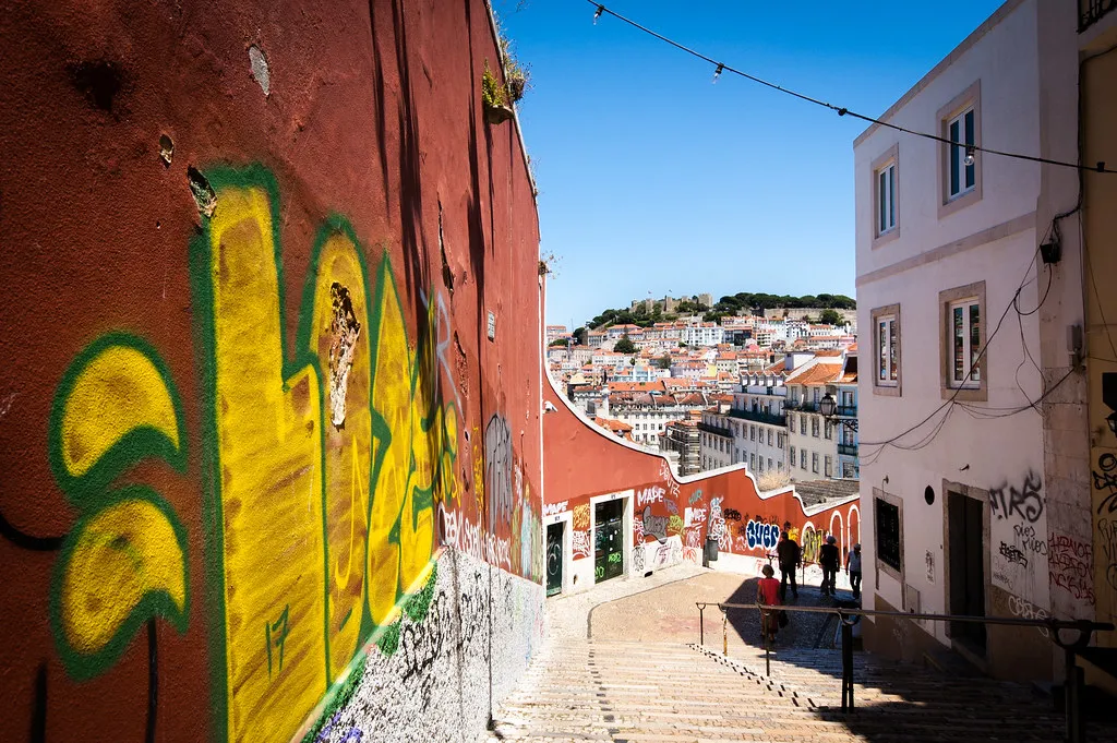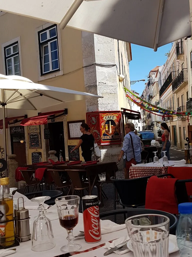 Arkitekturen og fargene på byggene i Lisboa skiller seg litt ut fra det vanlige. Morsomt å se friske farger på byggene. Her er et bilde tatt på vei ned igjen fra restauranten: